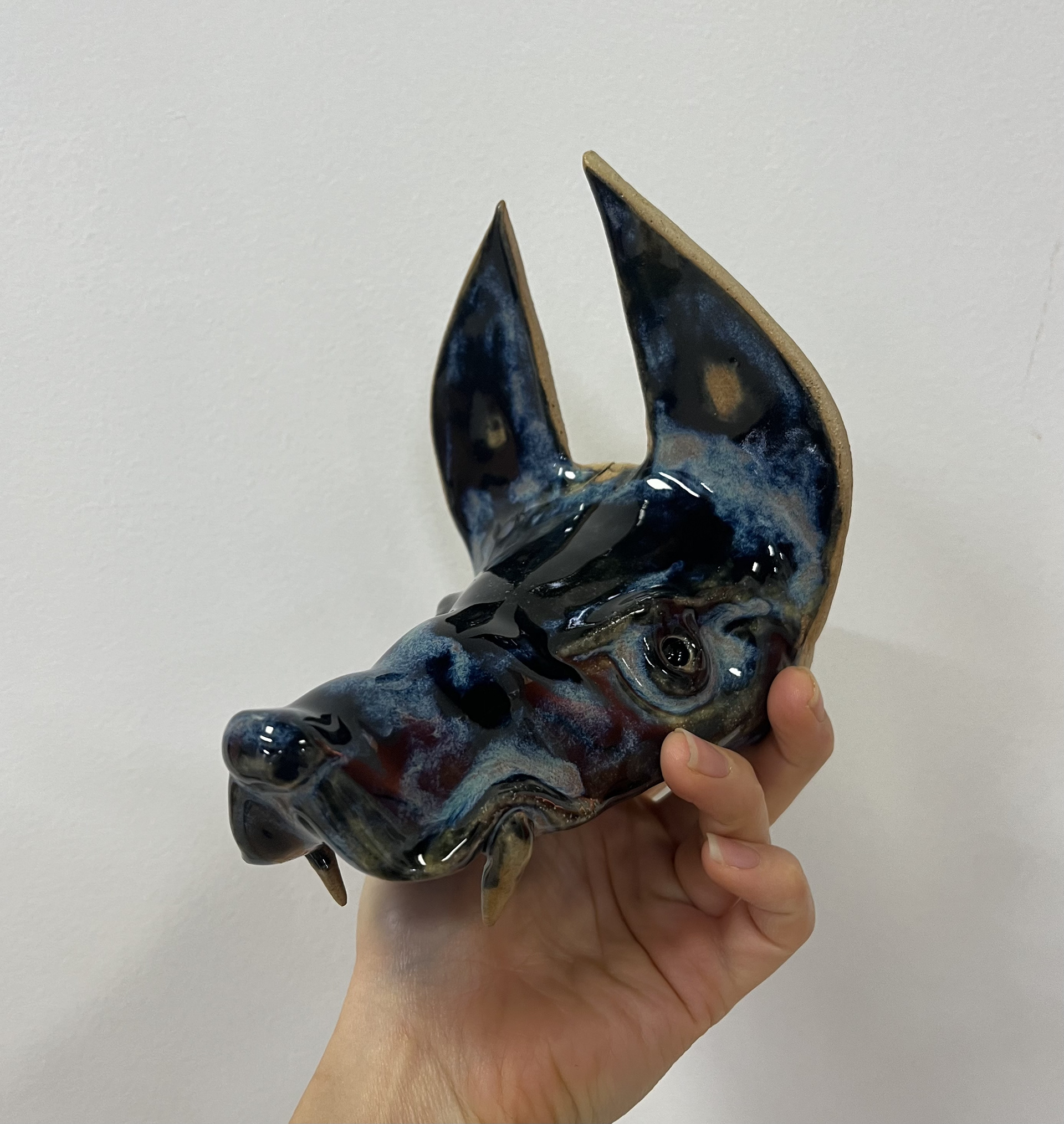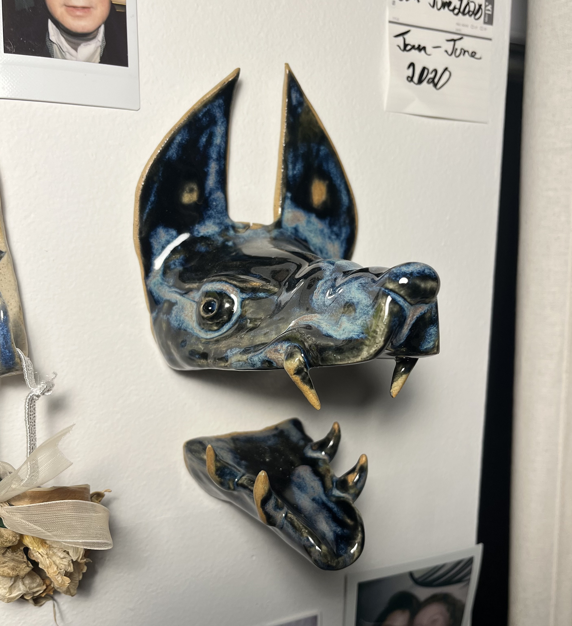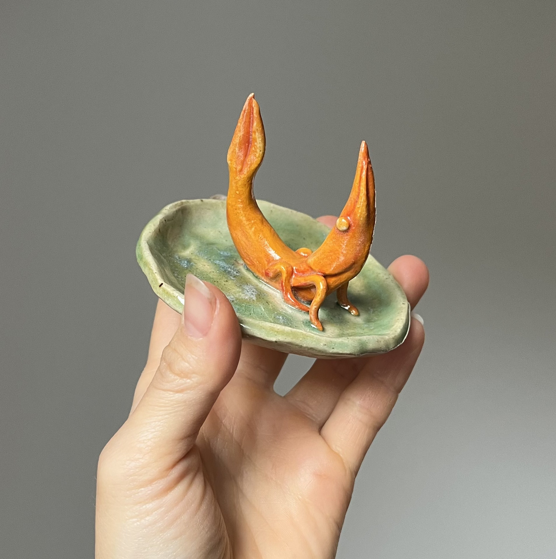 Three silly little ceramic products created in the fall of 2024: a shrimp ring dish, snot river hidden jewelry holder, and doggy necklace hanger.