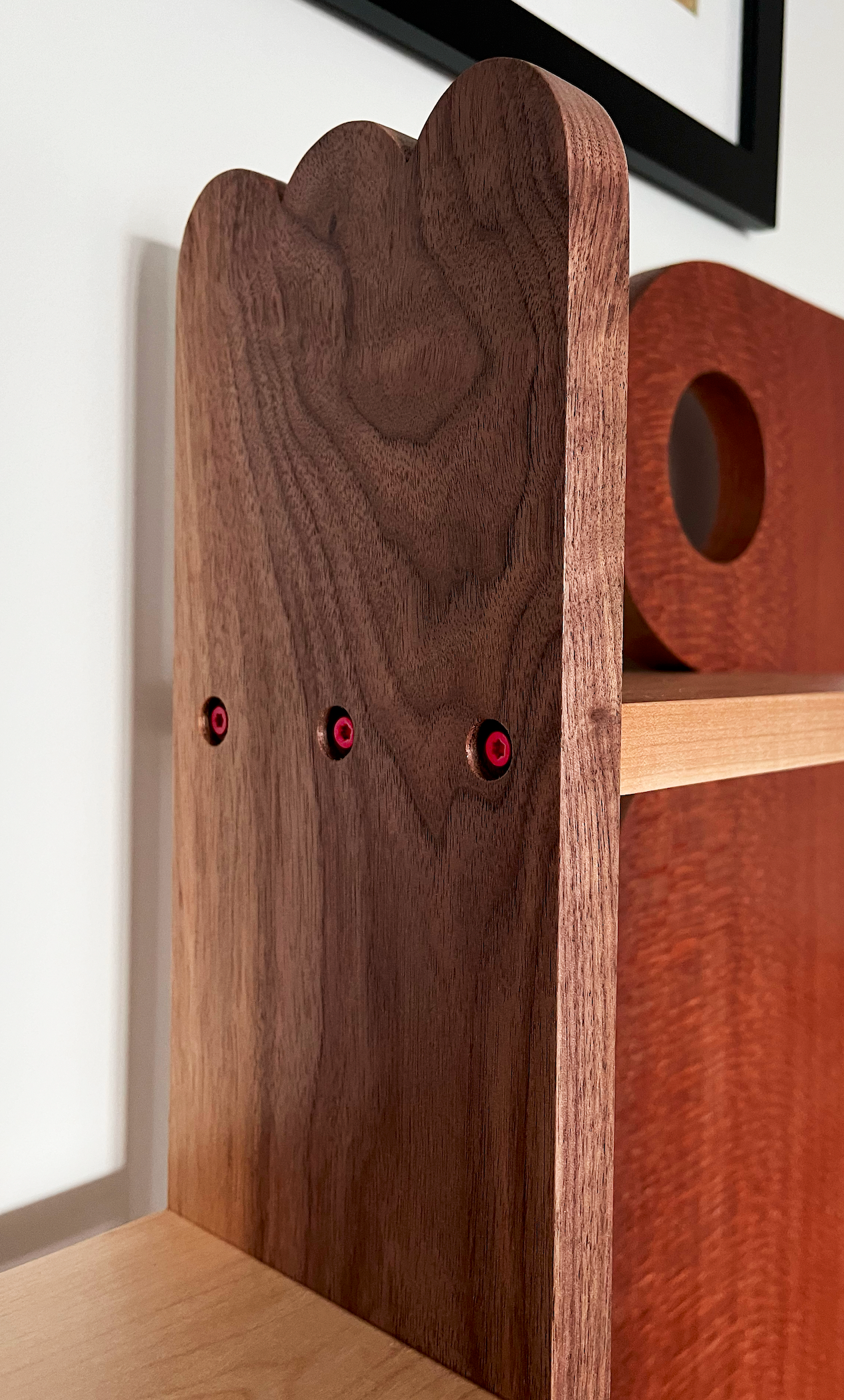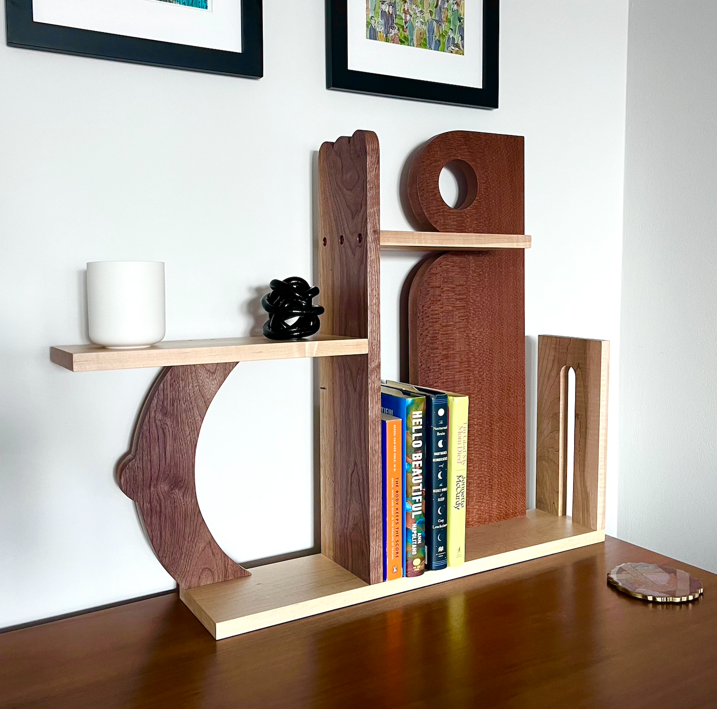 Unique and fun, this desktop shelf is a space to showcase small items as well as store books and supplies.