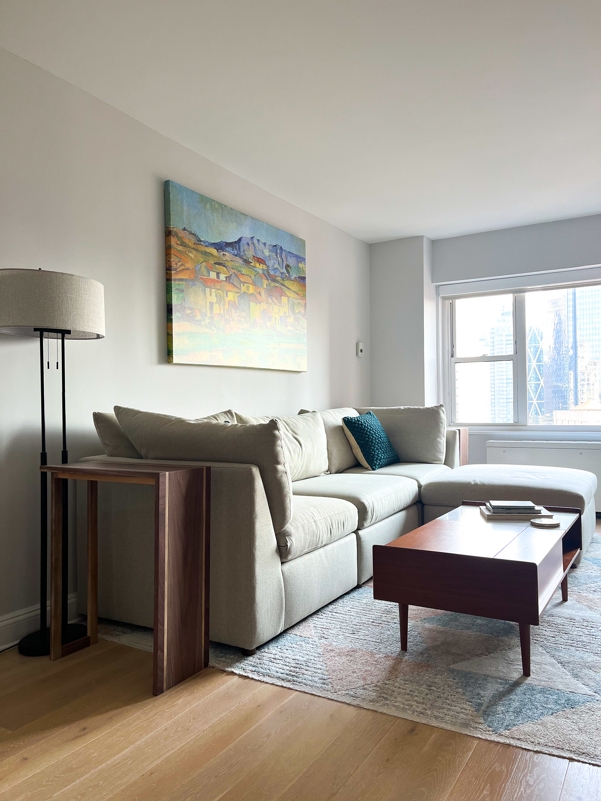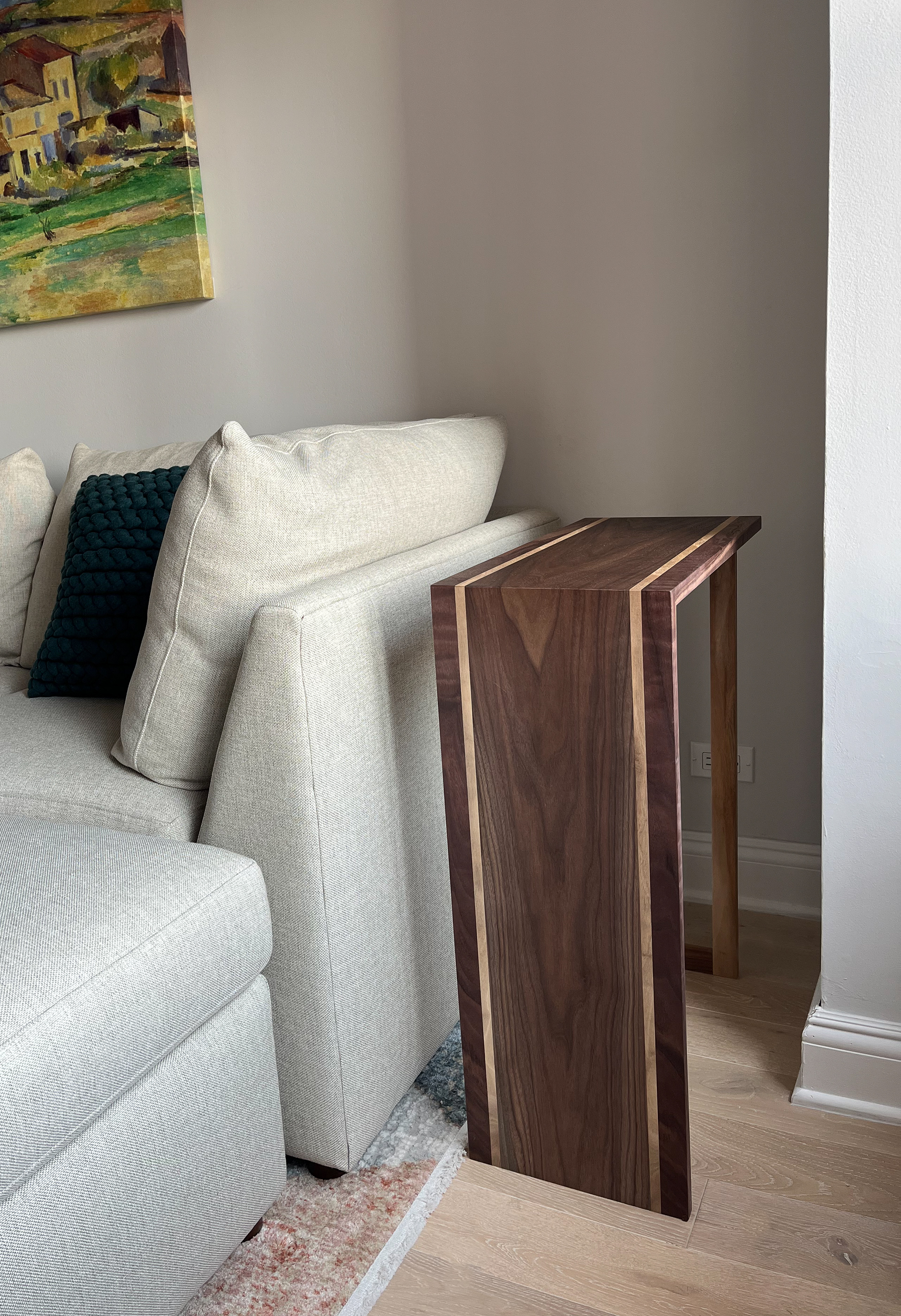 Custom waterfall couch side tables made from walnut wood.